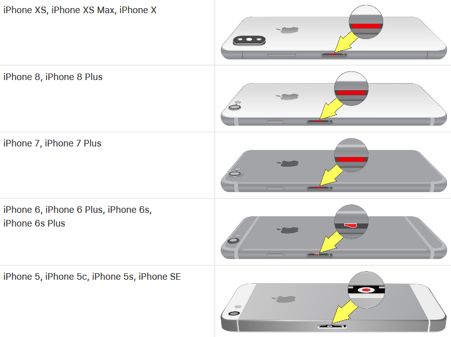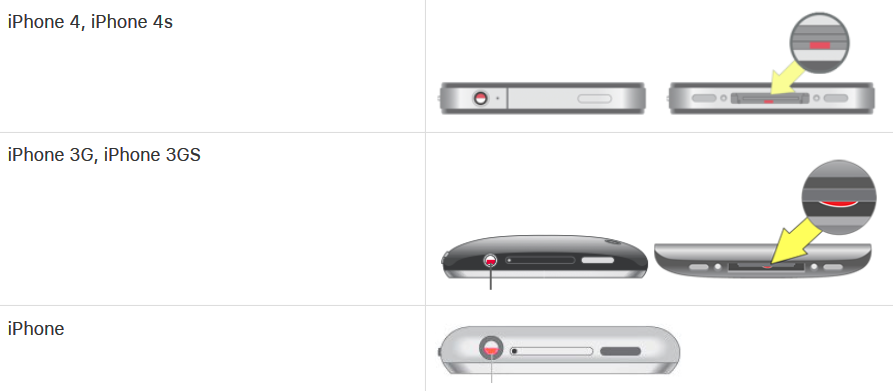 Где находится индикатор попадания влаги в iPhone? Вот таблица расположения индикатора во всех моделях: