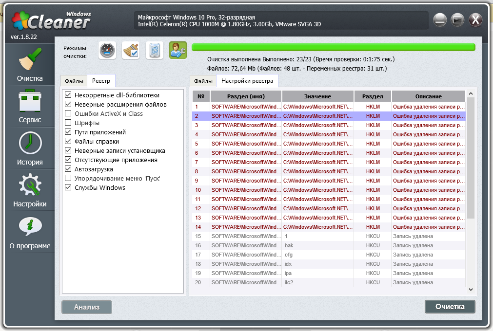 Есть и еще одна программа для очистки всей системы — Windows Cleaner. Правда, на ее сайте указано, что она поддерживает только системы до Windows 8 включительно. Действительно, в Windows 10 программа не работала так, как нужно (во всяком случае, с очисткой журнала Edge она не справилась). Но на более старых «Окнах» она вполне имеет право на существование.