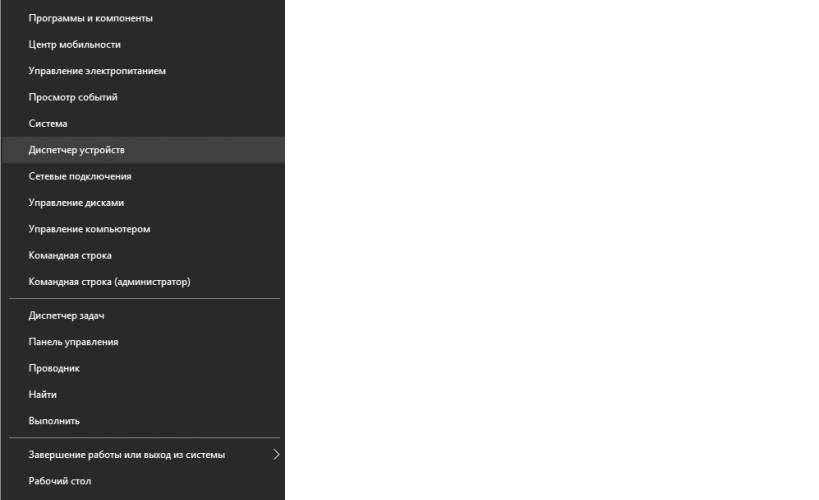 - Нажмите правой кнопкой мыши на «Пуск» и выберите в выпадающем меню пункт «Диспетчер устройств»;
