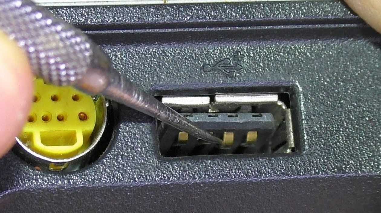 Путем осмотра можно выявить и повреждения порта или донгла. Бывает, что контакты разъема загибаются. Их можно выпрямить с помощью пинцета или маленькой отвертки.