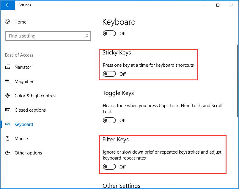 Иногда включение этих двух функций может остановить работу некоторых клавиш на клавиатуре, включая Backspace, Spacebar и Enter, как ожидалось. Таким образом, их отключение может быть полезным, что было доказано некоторыми пользователями.