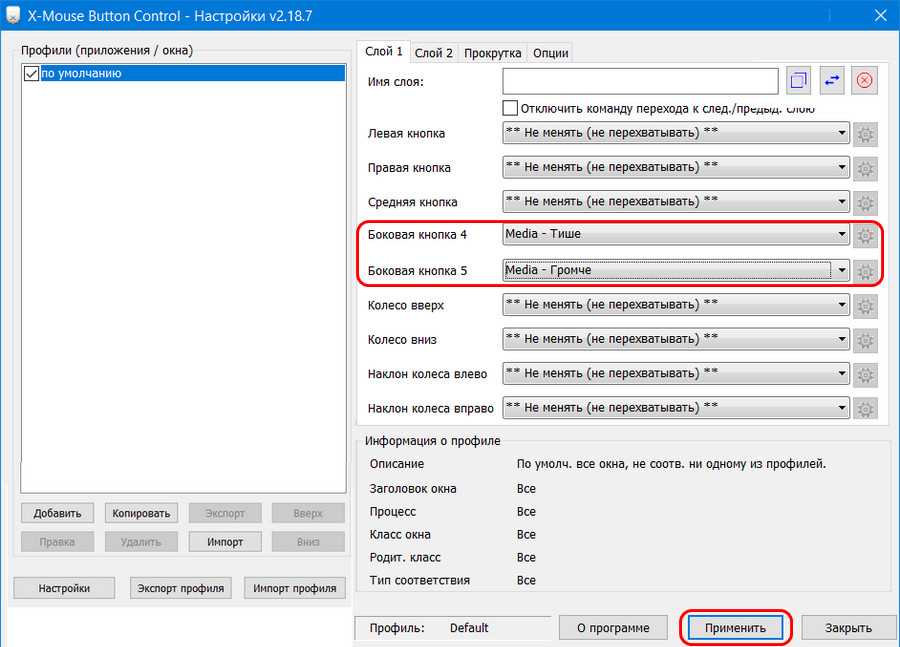 Все эти операции доступны как для основного профиля настроек мыши, так и для отдельных профилей программ.
