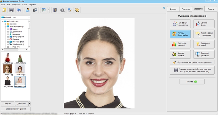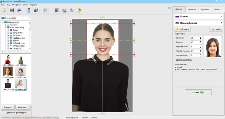 Если вы хотите сделать фотоснимки на паспорт, визу и т.д., воспользуйтесь программой Фото на Документы Профи. Она позволяет быстро подогнать кадр под нужный формат, разметить лицо для соответствия официальным требованиям и объединить несколько фото на одном листе.