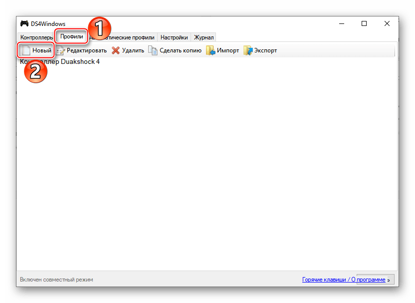 Если во вкладке «Контроллеры» геймпад определился, можно запускать игру. При этом есть возможность создать пользовательский профиль – изменить раскладку, настроить тачпад, световую панель и др. Для этого открываем вкладку «Профили» и жмем «Новый».