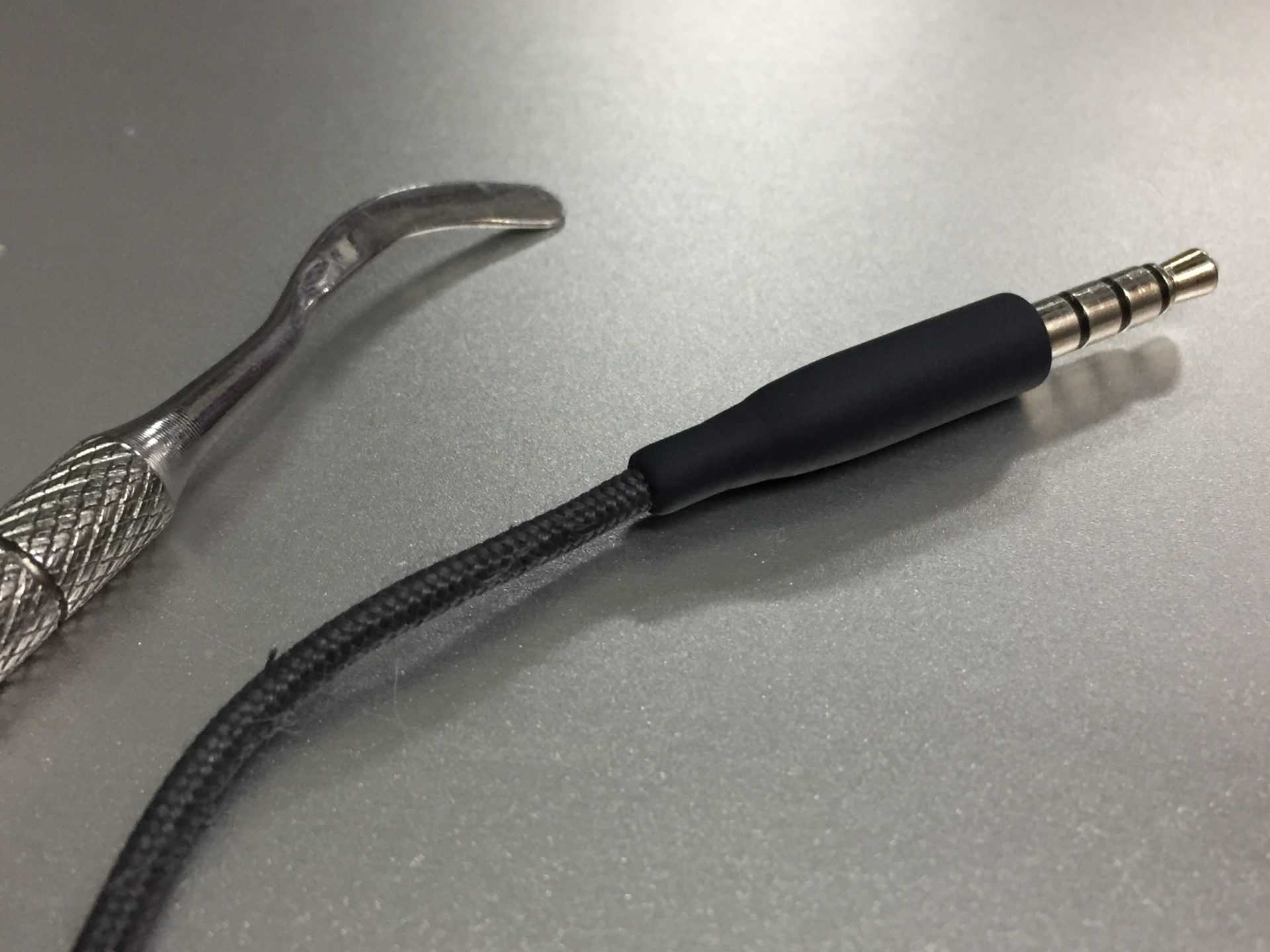 После разборки телефона стало видно, что один из пары проводов в обрыве, во втором проводе часть жил тоже была оборвана. С учетом того, что шнур на входе в наушник тоже изношен, необходимо удалить всю непригодный его часть.