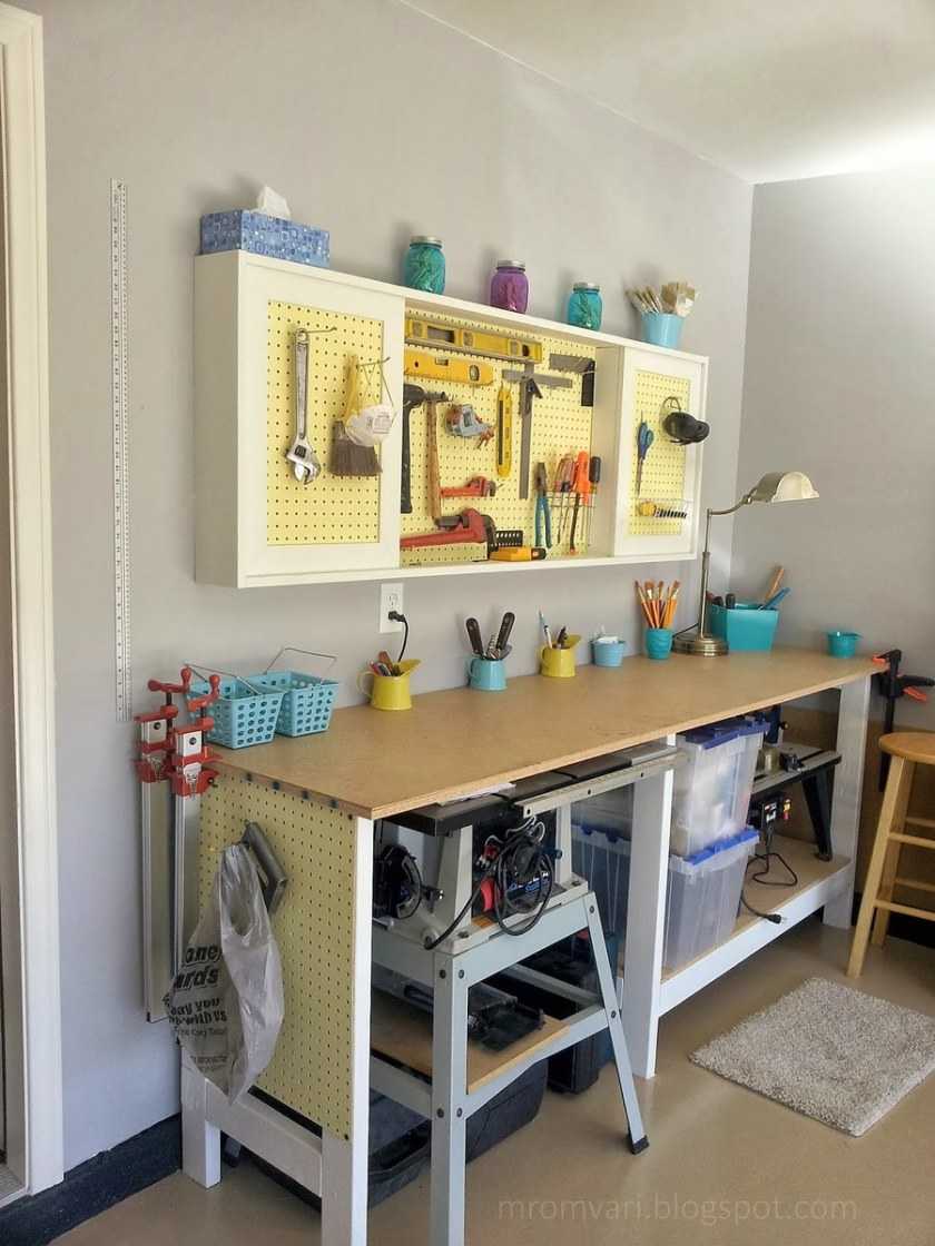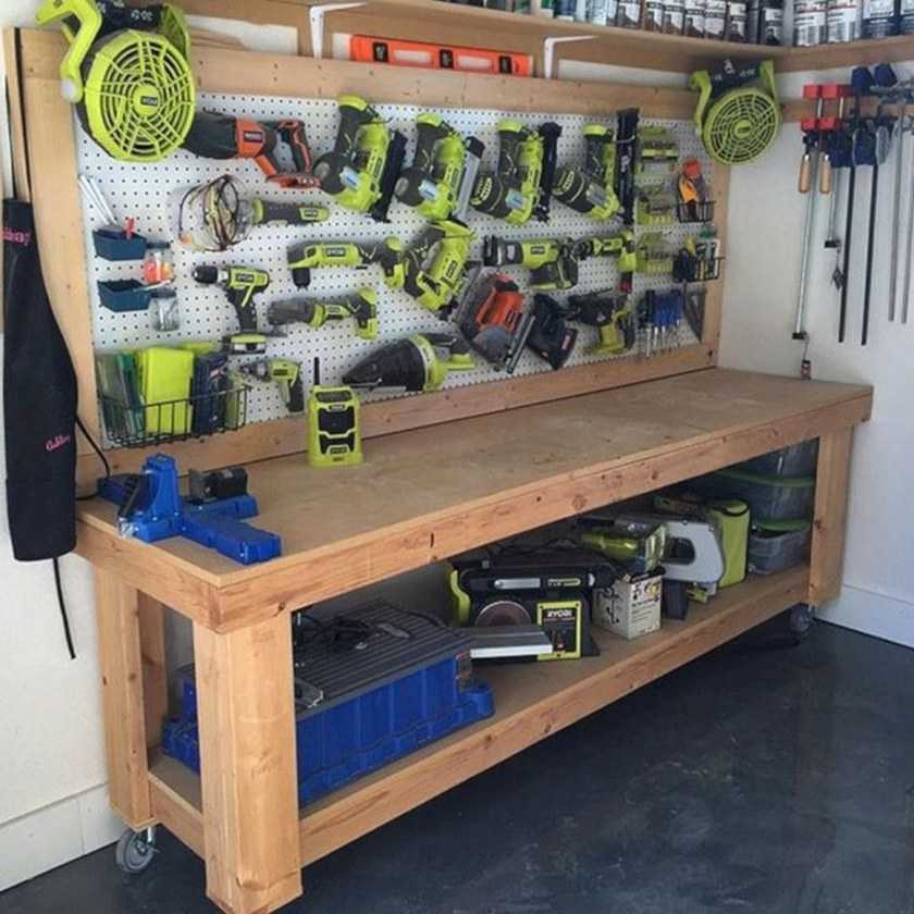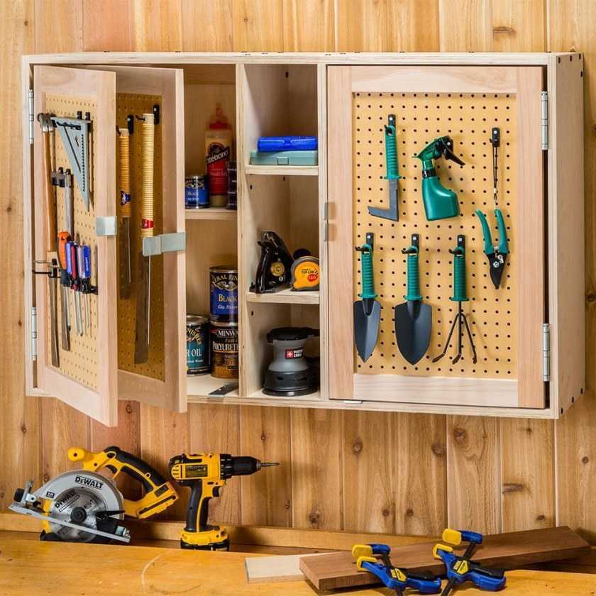 Как правило, больше всего места занимает инструмент, своими руками для гаража можно соорудить довольно удобные, вместительные и небольшие системы хранения. В закрытых ящиках хранить инструменты неудобно, постоянно приходится искать нужный предмет. Оптимальное решение – монтаж металлической сетки.