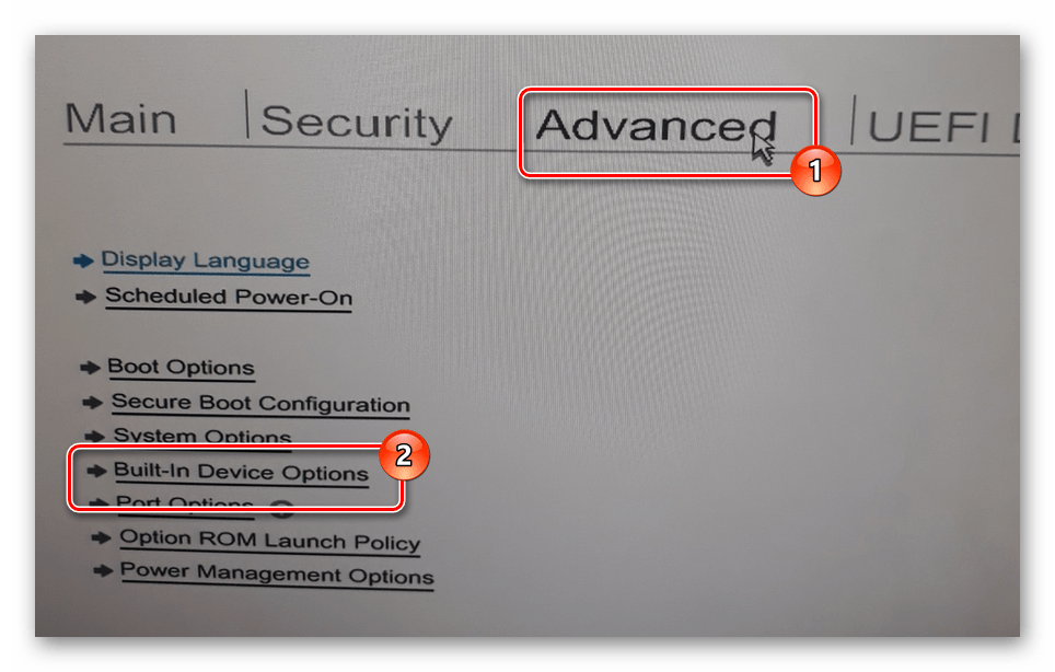 Если вы используете одно из таких устройств, в окне «Advanced» кликните по строке «Built-in Device Option».