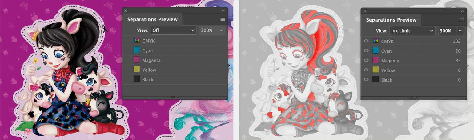 Процент наложения показывает параметр Total Ink Limit. Области, где суммарный процент превышает нужную вам норму, будут выделены красным: