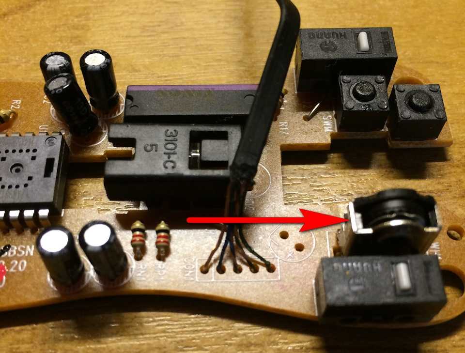 Осталось вставить провод разъема в разъем на плате. Затем аккуратно проложите провод над корпусом мыши