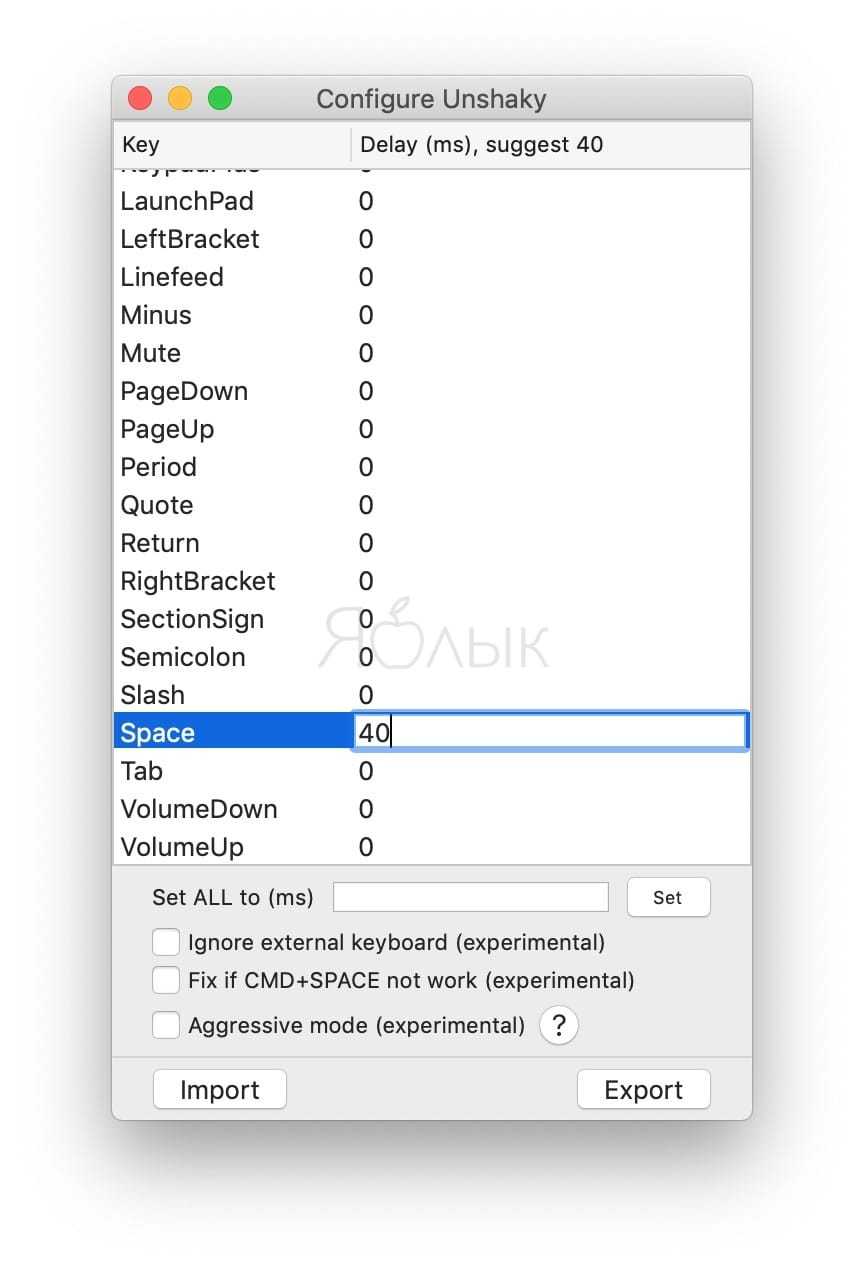 В качестве временного решения проблемы, воспользуйтесь утилитой Unshaky, которая позволяет установить минимальную временную задержку между нажатиями клавиш MacBook, благодаря чему исключается ввод символов из-за случайных залипаний. Начните с 40 мс и постепенно увеличивайте интервал, если установленный ранее оказался недостаточным. Универсального значения для всех пользователей не существует. Всё это строго индивидуально и зависит от модели MacBook, а также степени засорённости клавиатуры.