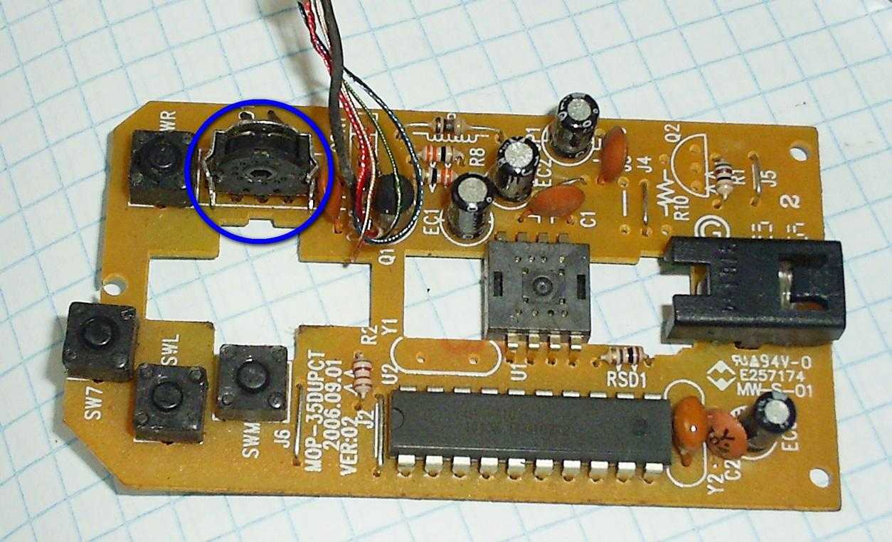 Над схемой не проводим никакой диагностики для элементов электроники (диагностика проводится в крайнем случае). На двух фотоснимках (фото 2) в увеличенном плане видно колесико с осью, передающее сигнал своего вращения схеме. В правом фотоснимке, на двух концах оси колесика можно заметить мелкие фрагменты волоса, ворса и пыли. Ватной палочкой аккуратно удаляем мелкие фрагменты ворса и пыли, если какие то соринки удаляются плохо, — используется пинцет.