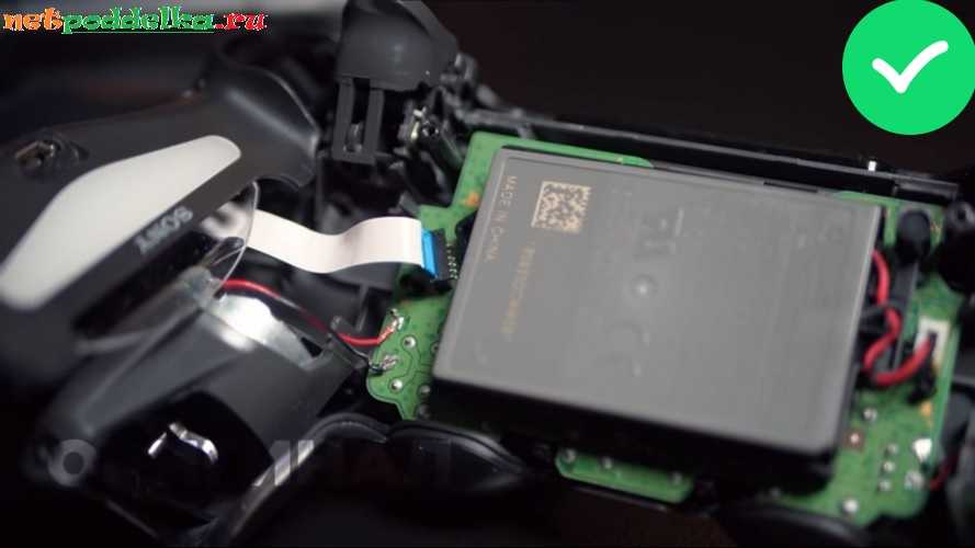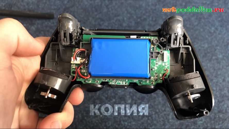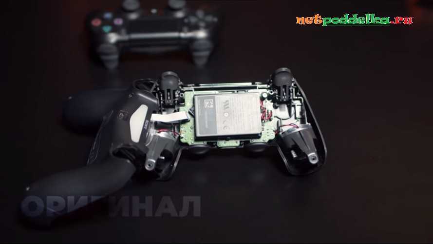 При покупке б/у Дуалшок 4 нередко удается договориться с продавцом на осмотр внутренностей геймпада. Для этого достаточно открутить все шурупы с тыльной стороны и располовинить корпус. У оригинала под крышкой находится фирменная плата с логотипом и аккумулятор в пластиковом корпусе.
