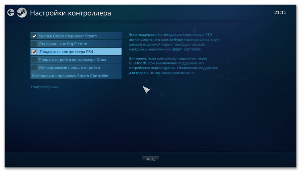 Как и в случае с DualShock 4 USB Wireless Adapter, вам также доступен весь функционал вашего контроллера. Минусами этого способа является необходимость предварительной настройки большинства игр, которые есть у вас в библиотеке Steam, а также невозможность пользоваться Дуалшоком 4 в PlayStation Now.
