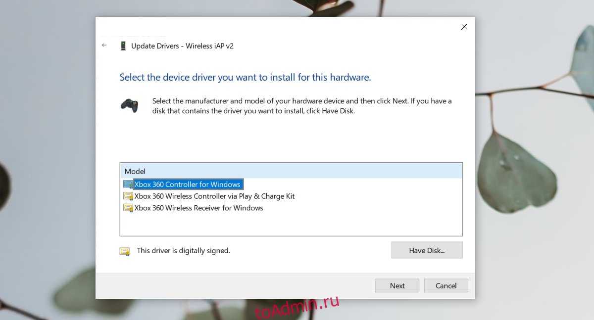 Подключите контроллер к ПК.Откройте диспетчер устройств.Разверните Другие устройства.Под ним вы увидите «Неизвестное устройство».Щелкните его правой кнопкой мыши и выберите «Обновить программное обеспечение устройства».Выберите «Найти на моем компьютере драйверы».Выберите вариант «Я выберу из списка…».Прокрутите вниз и выберите параметр «Периферийные устройства Xbox 360».Выберите самый новый из доступных драйверов.Установите его и примите любые запросы, которые вы видите на экране.Драйвер будет установлен, и вы сможете использовать контроллер в своих играх.