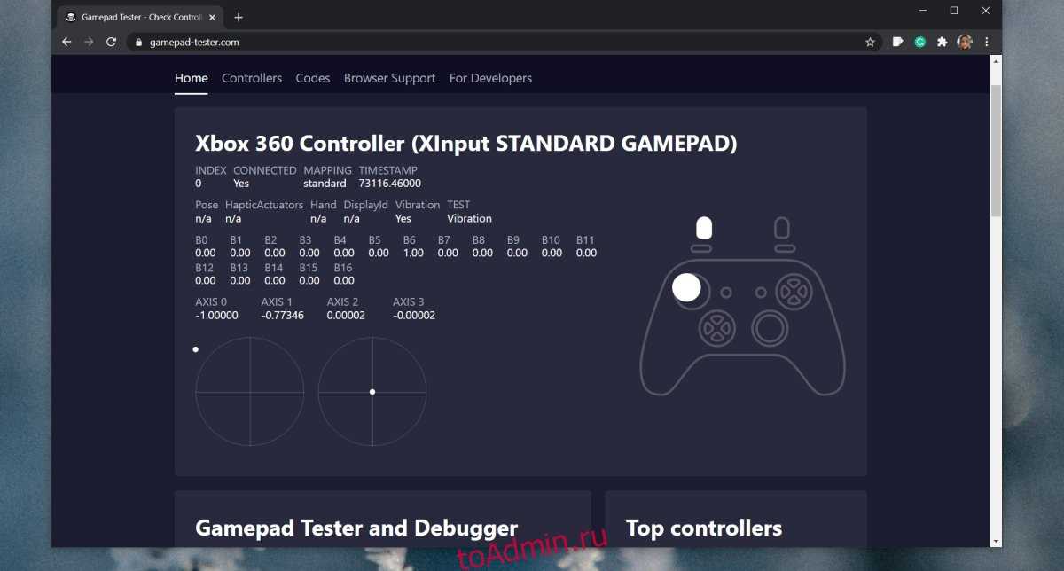 Посещение Тестер геймпада.Ваш контроллер должен быть обнаружен автоматически.Нажмите кнопки или один из джойстиков, и вы должны увидеть ввод на экране.