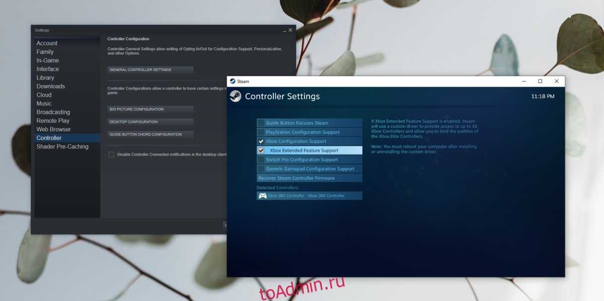 Подключите контроллер к вашей системе.Откройте Steam.В строке меню перейдите в Steam> Настройки.Перейдите на вкладку Контроллер.Щелкните Общие настройки контроллера.Включите поддержку контроллеров Xbox.Перезагрузите Steam и вашу систему.