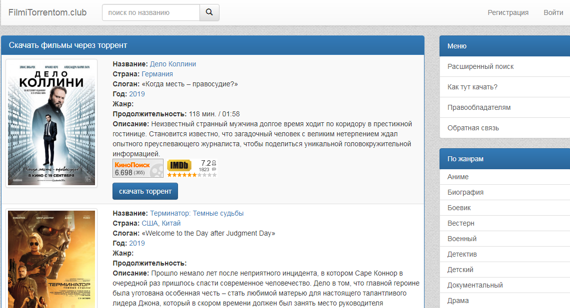 Регистрация для использования сайта не требуется. Все фильмы возможно скачать только с использованием торрент-клиента. Да-да, вы абсолютно правы — его придётся установить сначала перед началом использования ресурса.