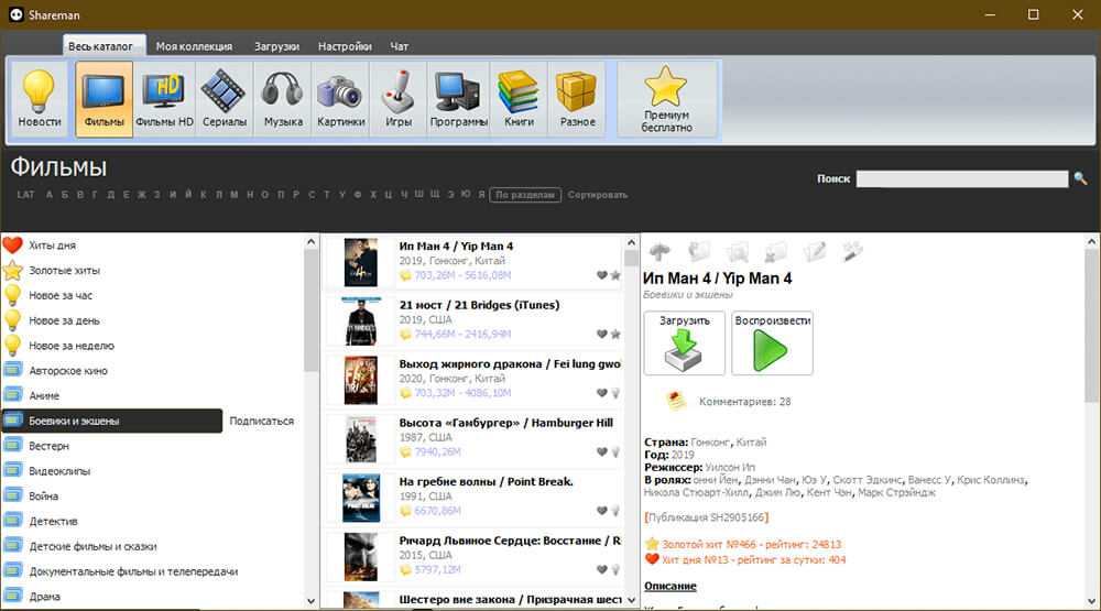 По сути является торрент-клиентом, однако в отличие от них предлагает обширную внутреннюю коллекцию контента. Она разбита по жанрам, разделам и алфавиту, поэтому вы сможете быстро найти нужный объект. Пополняется галерея другими пользователями, включает в себя новинки, классику кино, ТВ-шоу.