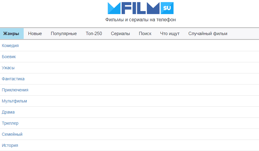 Прочитали столько информации и всё ещё озадачены вопросом, где скачать фильм на телефон бесплатно? Ну что ж, представляем вашему вниманию сайт mobilfilms.org. Этим ресурсом, в принципе, можно и на десктопе пользоваться. Чтобы скачать фильм регистрироваться не нужно. Ленты, представленные на сайте, можно отсортировать по жанру и году выпуска.