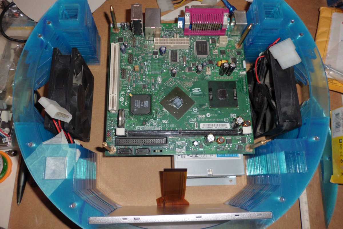 Основная часть корпуса состоит из деталей, вырезанных из прозрачного акрила толщиной 5 мм. Общая толщина средней части корпуса — 10 см.