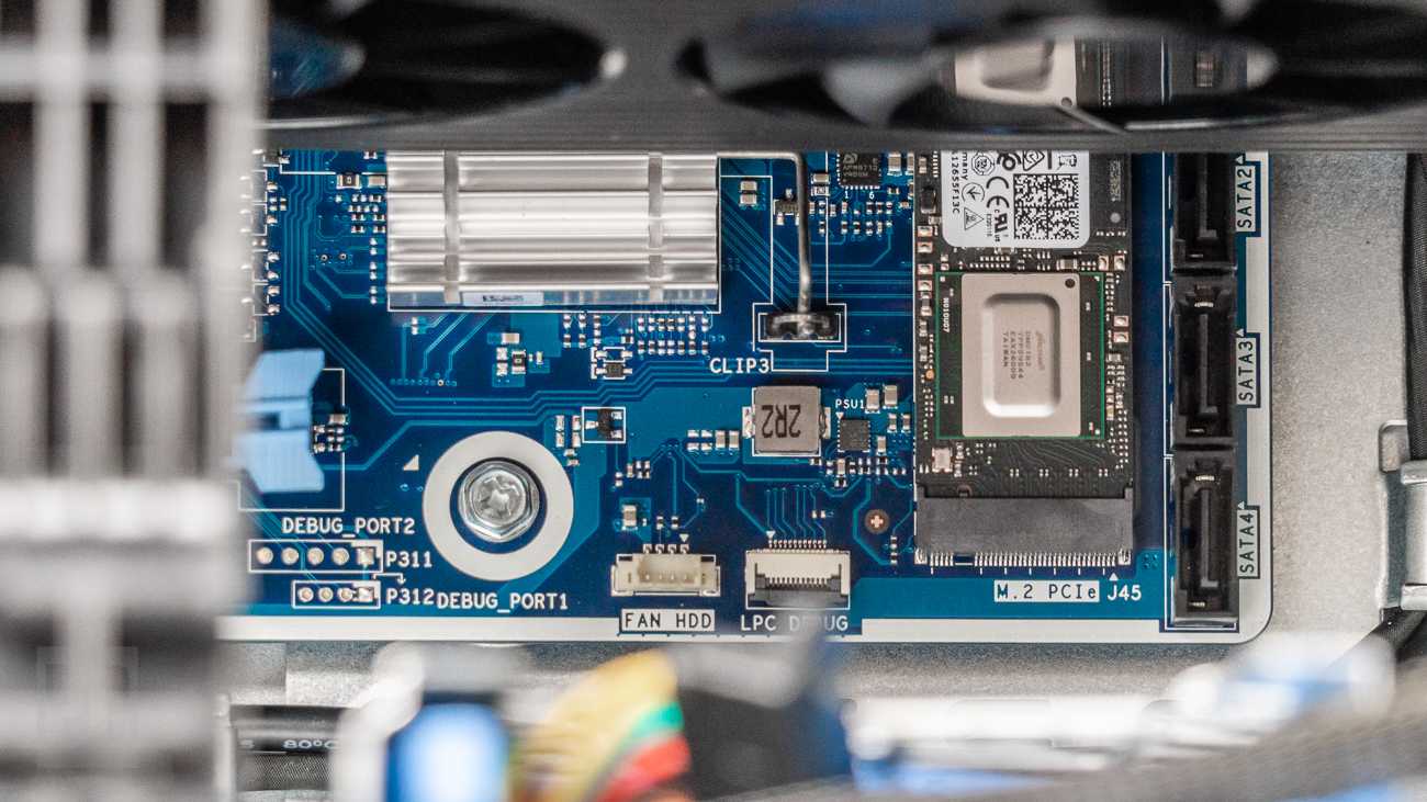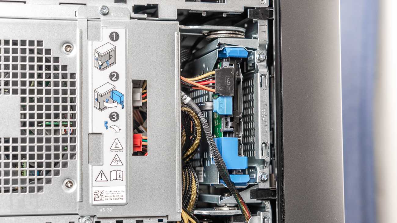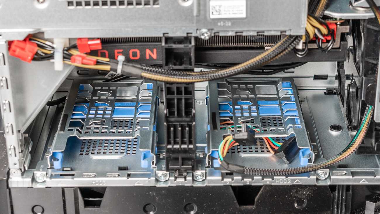 Интерьер выглядит многолюдным, но вполне исправным. Передний 3,5-дюймовый отсек и два нижних 2,5-дюймовых отсека легко доступны. Кассеты без инструментов упрощают замену дисков.