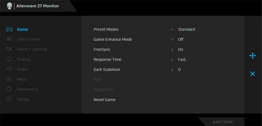 Каждый из индикаторов на корпусе монитора настраивается либо из быстрого и отзывчивого экранного меню (OSD) (им управляет четырехпозиционный джойстик на задней панели), либо через Центр управления Alienware программный пакет, если дисплей подключен к компьютеру через USB. К сожалению, ни экранное меню, ни командный центр не предлагают тонны дополнительных настроек, отказываясь от более глубокой настройки цвета и инструментов калибровки в пользу длинного списка предустановленных игровых профилей.