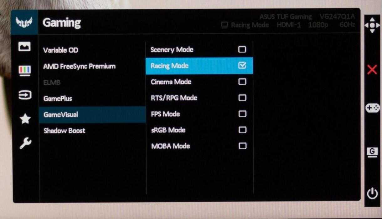 ASUS TUF Gaming VG247Q1A управляется с помощью трех аппаратных кнопок и 5-позиционного джойстика, расположенных в правом нижнем углу. На две кнопки можно назначить пользовательские функции в системном меню (по умолчанию это вызов игрового меню GamePlus и меню видеорежимов GameVisual), отклонение джойстика, равно как его нажатие, вызывает быстрое меню – с доступом к главному и горячим клавишам.