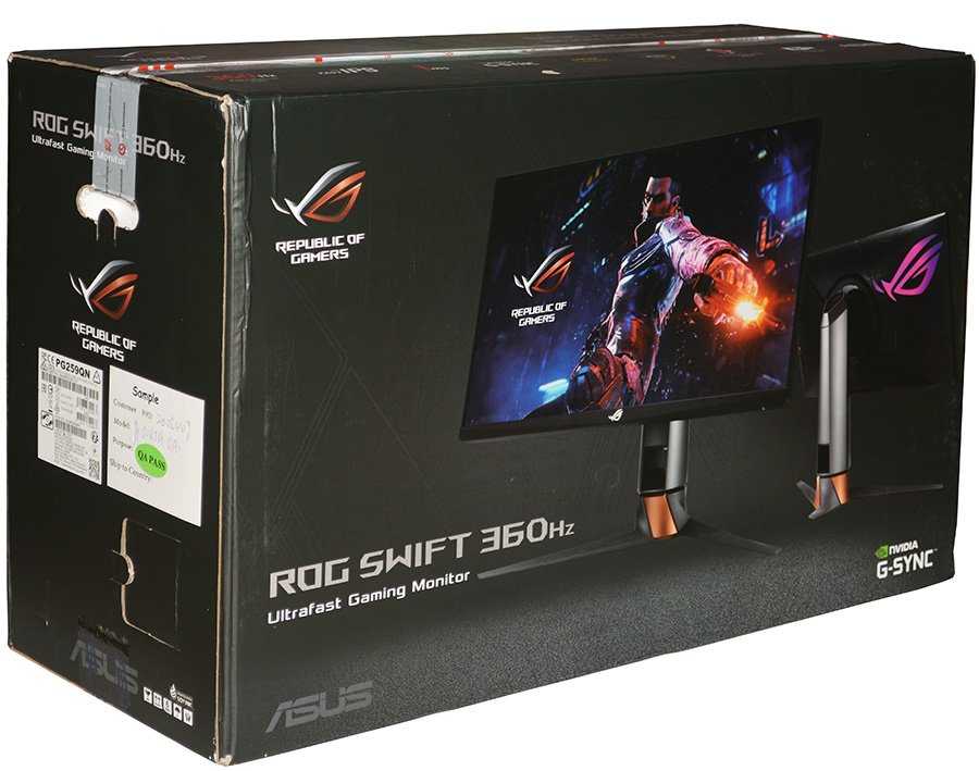ASUS ROG Swift PG259QN поставляется во внушительной картонной коробке с яркой полиграфией. Упаковка ярко оформлена и обладает неплохой информативностью. Помимо изображения самого устройства, здесь мы найдем полное название модели и основные ее достоинства, а также технические характеристики.