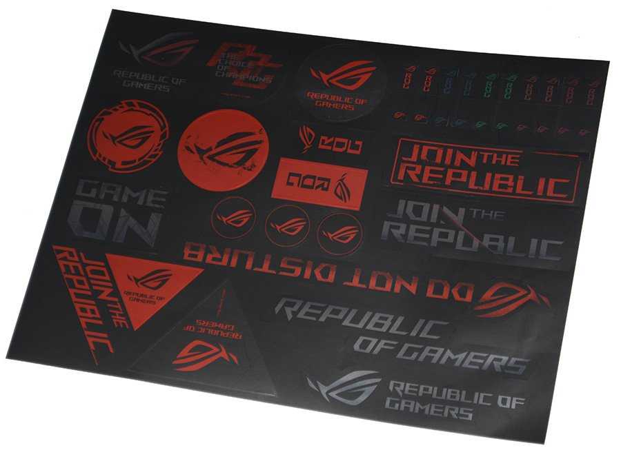 Ножку монитора можно назвать отдельным произведением искусства. Во-первых, она красива, а во-вторых, в ней, помимо отверстия для удобной прокладки кабелей, размещено три источника подсветки. В верхней части ножки находится проектор, ROG Light Signal, которые проецирует на стену лого Republic Of Gamers. Для смены угла проекции в верхней части ножки предусмотрено колёсико. Отдельный светящийся логотип ROG, расположенный рядом с проектором, относится к системе подсветки Light Signature. Она уже несколько лет встречается у дисплеев ASUS ROG. С её помощью можно спроецировать на стол, по центру ножки, логотип ASUS ROG. Ну а при желании его можно заменить на ник игрока, символ клана или значок любимой игры. Для этого в комплекте с монитором поставляются 4 сменные пластины, которые можно раскрасить самостоятельно. Полная свобода творчества!