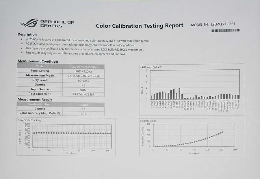 Новый ASUS ROG Swift PG259QN не требует полноценной калибровки и может обойтись небольшими ручными правками с дальнейшим профилированием (созданием профиля, описывающим возможности дисплея для ОС и приложений с поддержкой CMS).
