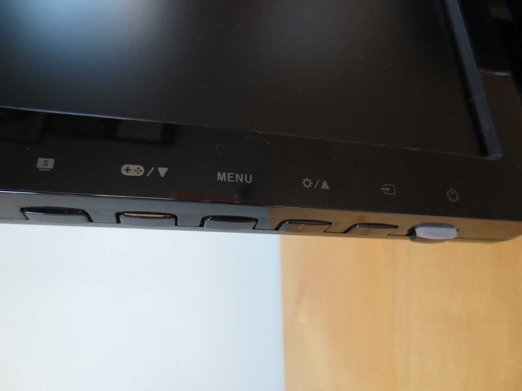 At the bottom right there are labels for the monitor control buttons; ‘Splendid mode’ (presets), ‘GamePlus’ (on-screen crosshair and timer)/down, menu, brightness/up, source select and power. On the underside there are buttons that can be pressed (not touch sensitive) and are nicely spread out and easy to operate.