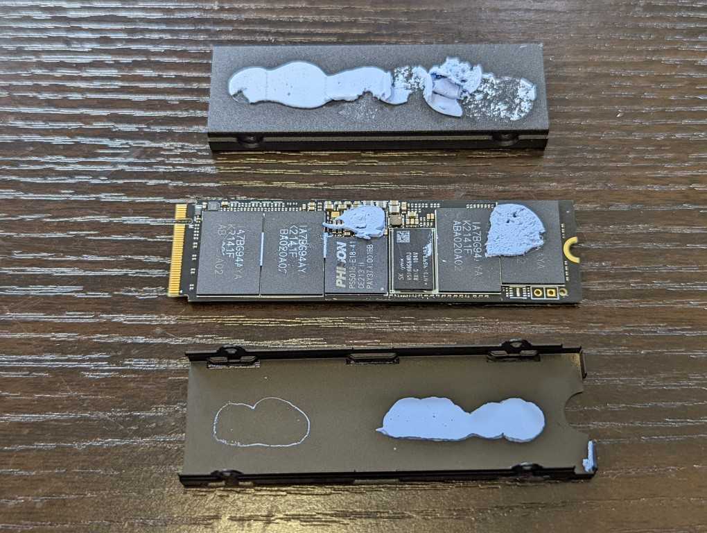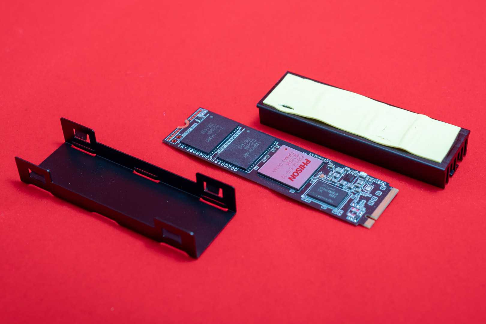 Теплопроводящая прокладка в форме плоской жевательной резинки подогнана под размер накопителя.