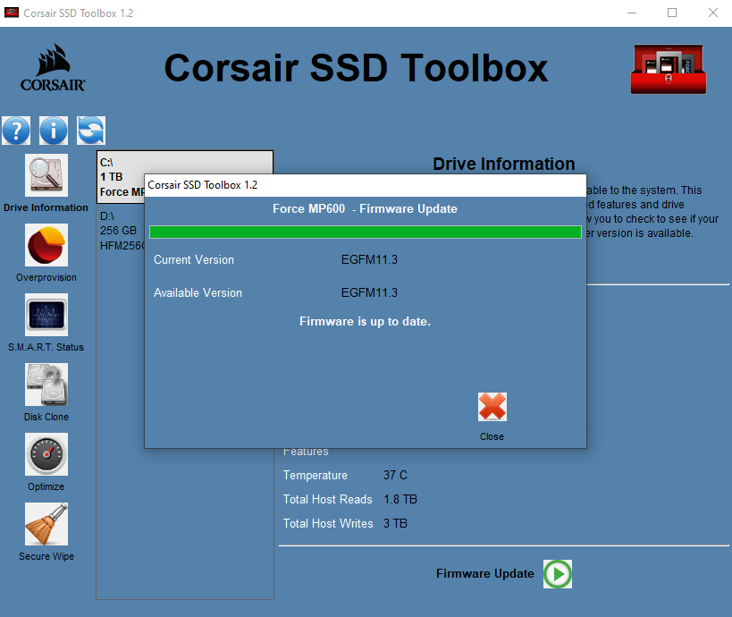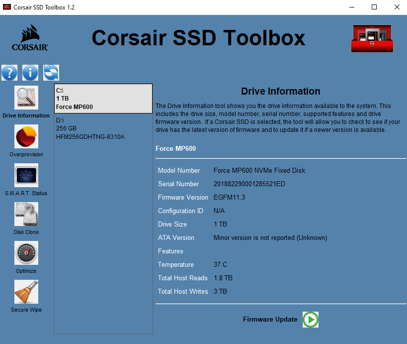 Следить за состоянием, оптимизировать и проверять прошивку можно в фирменном приложении Corsair SSD Toolbox. В нем же можно делать клонирование для переноса данных и безопасное форматирование.