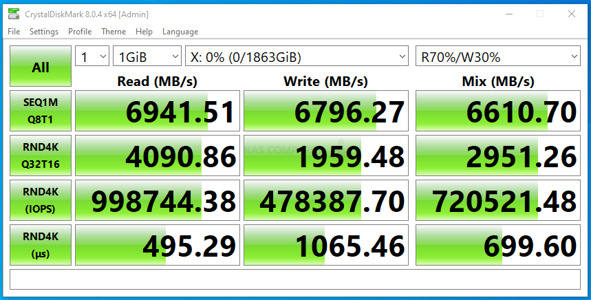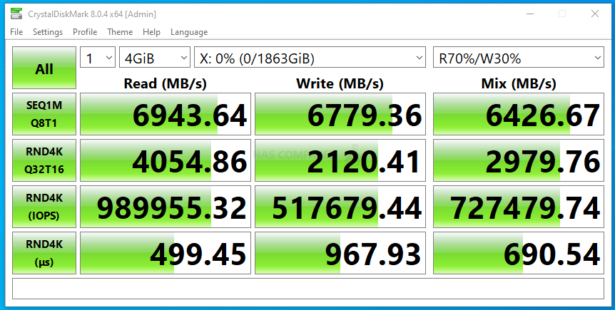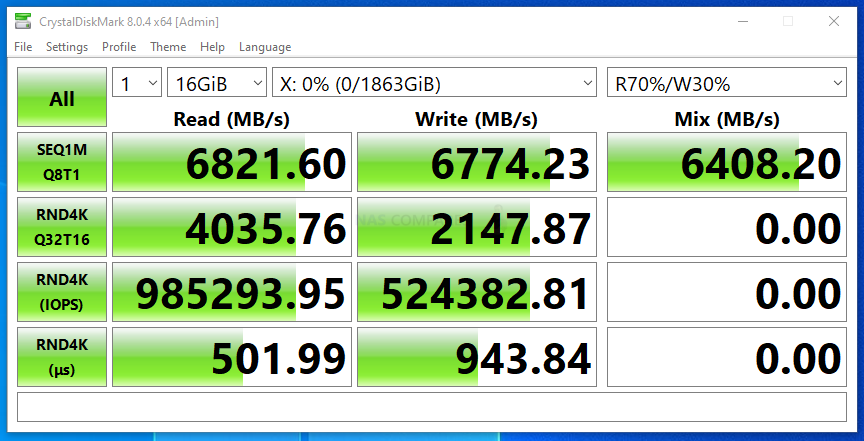 Далее я прогнал тест CrystalDiskMark 7 на сборке AMD со следующими результатами: