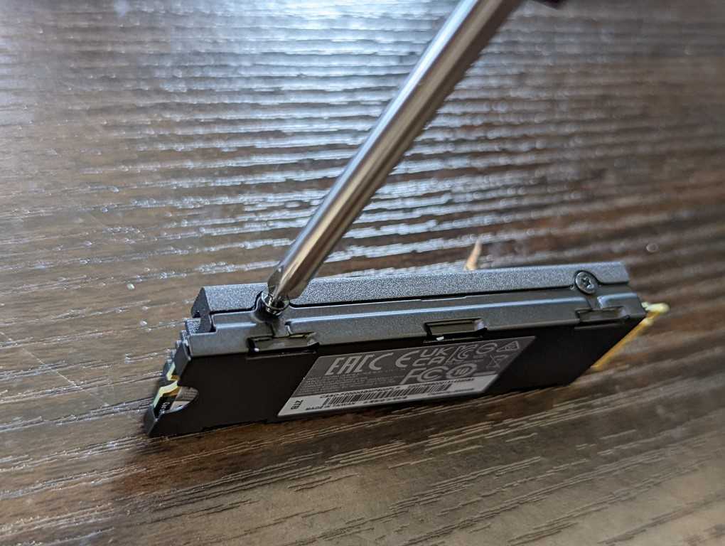 So that is the physical design of the Corsair MP600 PRO LPX SSD. But what about the hardware components themselves? Does the Corsair MP600 PRO LPX cut the mustard in terms of current generation hardware and protocols? Let’s find out. First thing’s first, let’s remove the heatsink of the Corsair MP600 PRO LPX, which is done by the removal of four individual Phillips head screw heads. Also, don’t do this! It will invalidate your warranty.