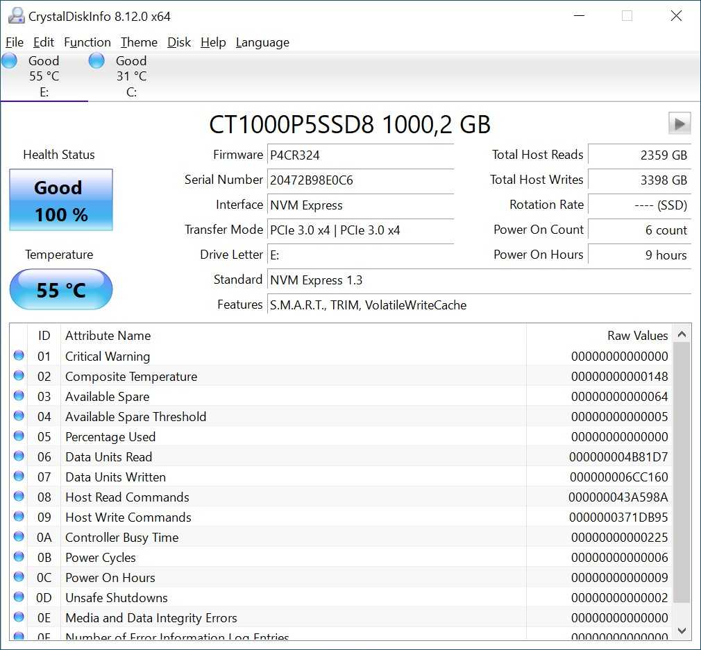 Ресурс записи данных в целом типичен для устройств на базе многослойной флеш-памяти с 3-битовой структурой ячеек. Наименее емкая модель получила TBW в 150 ТВ, 500 ГБ – 300 ТБ, для накопителя на 1 ТБ определен ресурс в 600 ТБ, а для топовой версия на 2 ТБ – 1200 ТБ. При этом Crucial P5 предлагаются с 5 летней гарантией производителя. Зачастую такой термин снимает беспокойство о возможном недостатке ресурса.