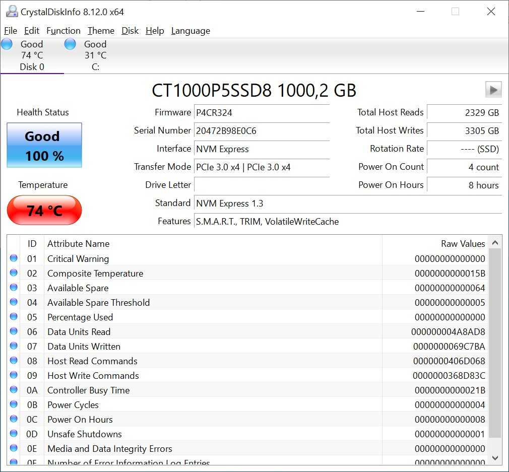 Под нагрузкой во время прохождения тестовых этапов чип прогревался до 74–77С. При этом стоит отметить, что температура контроллера повышается до 70+ градусов в том числе и на операциях чтения. Данные получены на открытом стенде при 20С в помещении.