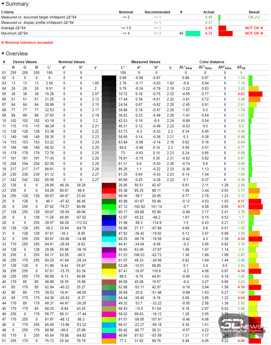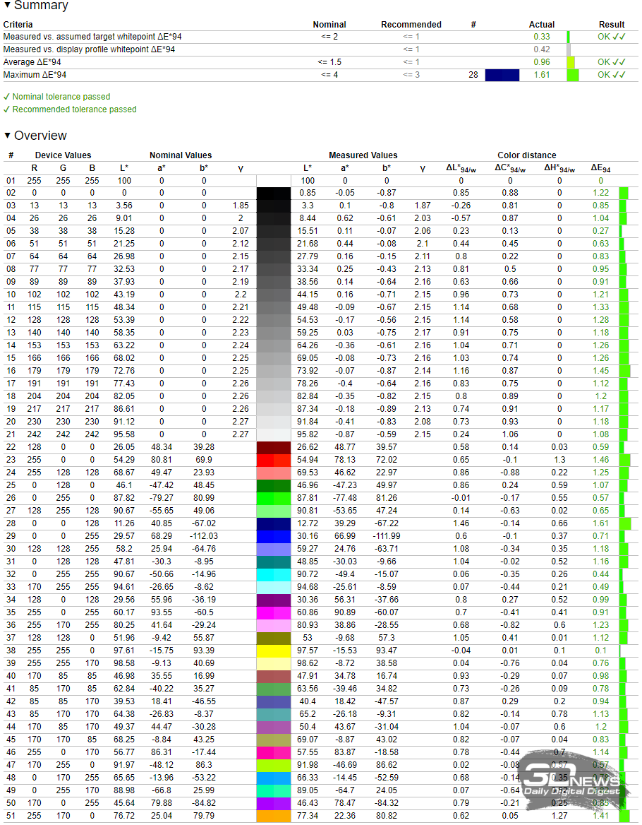 Тест Argyll пройден лишь в отношении точки белого: отклонения как среднего, так и максимального значения DeltaE выше даже минимальных требований теста. Впрочем, трудно было ожидать иного при использовании расширенного цветового охвата.