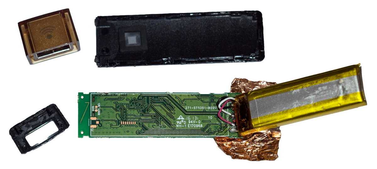 Сам аккумулятор держится на полоске двусторонней липкой ленты. Под ним видна тыльная сторона платы, а схема контроля заряда просматривается сквозь полупрозрачную пленку.