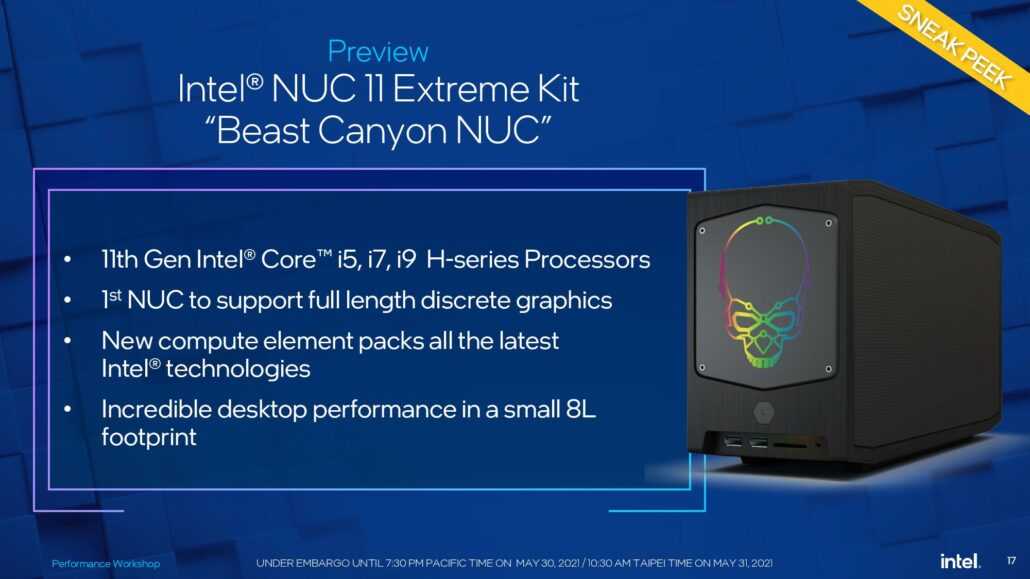 Также ожидается, что в серии NUC 11 Performance дебютирует дискретная графика Intel Xe. Новые микросистемы будут поддерживать до 64 ГБ двухканальной памяти DDR4-3200 SODIMM, память Intel Optane Memory M10, накопители и карты расширения форм-факторов M.2 22×80 M и PCIe x4 Gen4 NVMe.