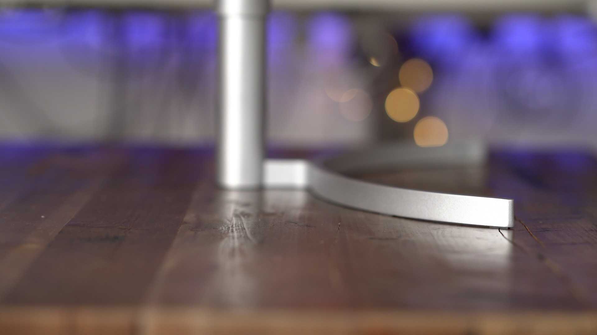 Здесь также используется «воздушная» подставка, в которой вместо традиционной «ноги» — тонкая панель из прозрачного пластика, из-за чего складывается впечатление, будто экран «парит» в воздухе. Серебристая подставка выполнена из металла и достаточно широкая, чтобы монитор стоял на ней устойчиво при попытке расшатать его из стороны в сторону. Из регулировок доступно лишь изменение угла наклона экрана – ни поворота вокруг своей оси, ни регулировки по высоте, ни тем более перевода в портретный режим у этой модели нет.