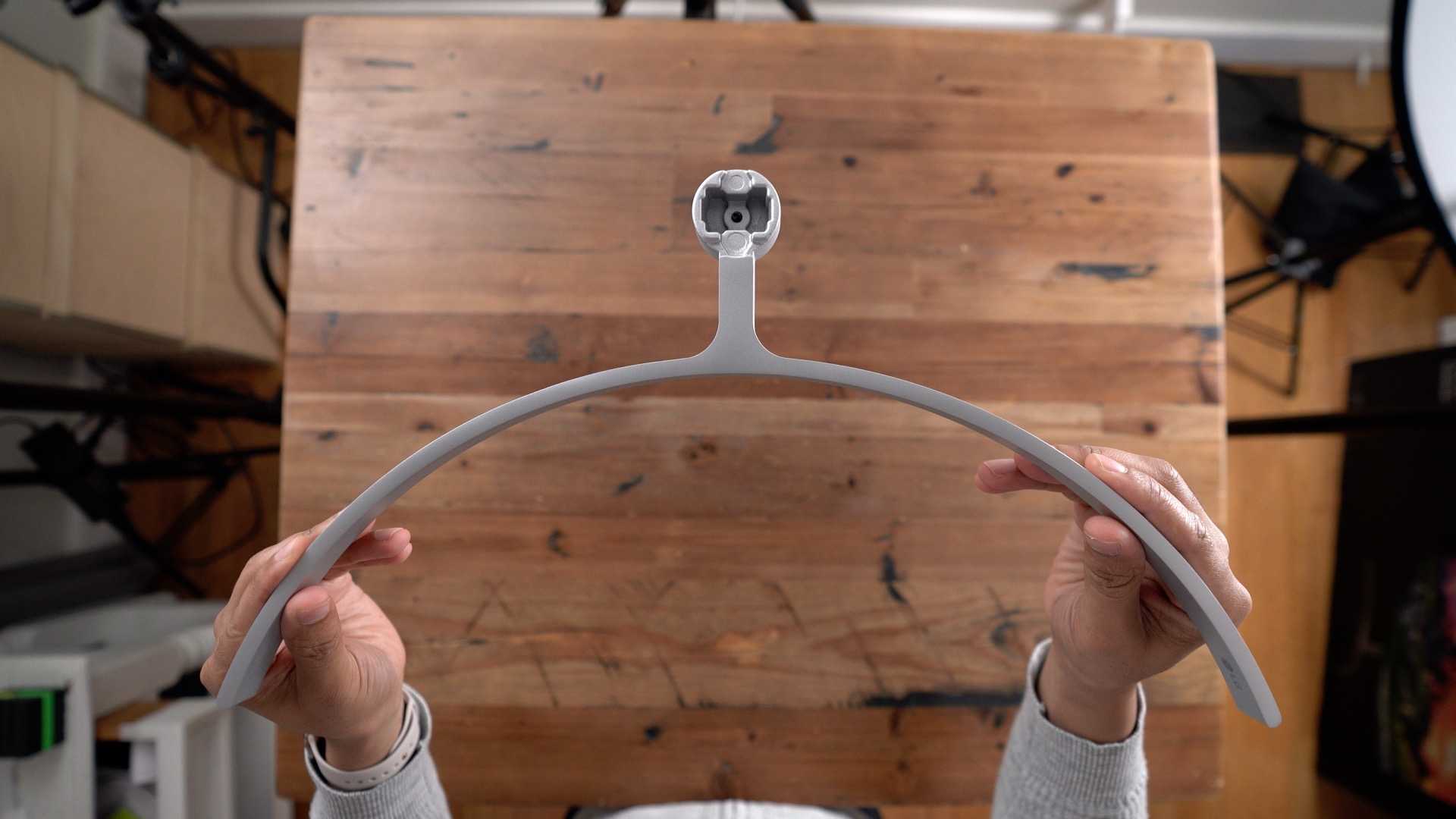 The arm pivots up and down to change viewing height, up to 110 mm, and there’s also -5~15 degrees of tilt. There’s no rotation for the display, which would be nearly impossible anyway given its wide-screen form factor, but there are a few degrees of play to make sure that the display is aligned parallel to its resting surface.