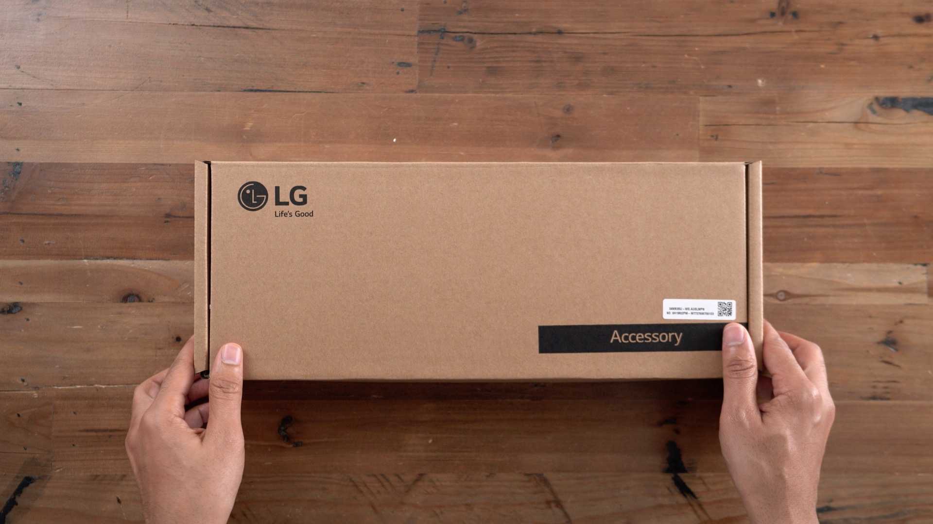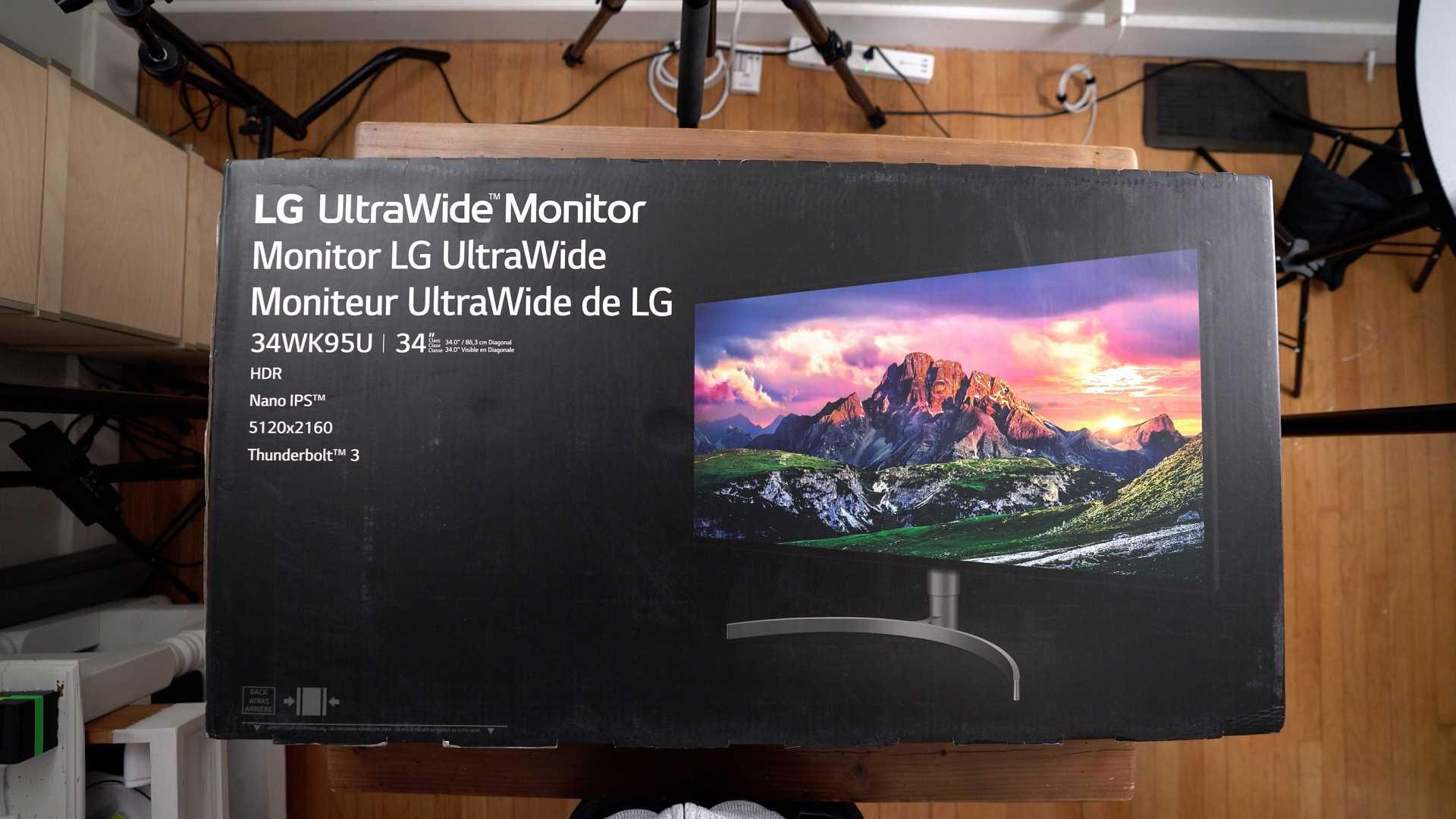 Мы начинаем этот анализ как всегда с распаковки LG 34WK95U-W — монитора, который поставляется в жесткой картонной коробке значительных размеров, особенно длинной. В нем нет ручки для его транспортировки, но у нас есть две типичные боковые ручки. Внешняя часть украшена очень эффектным образом, на белом фоне изображен монитор, обозначающий его дизайн.