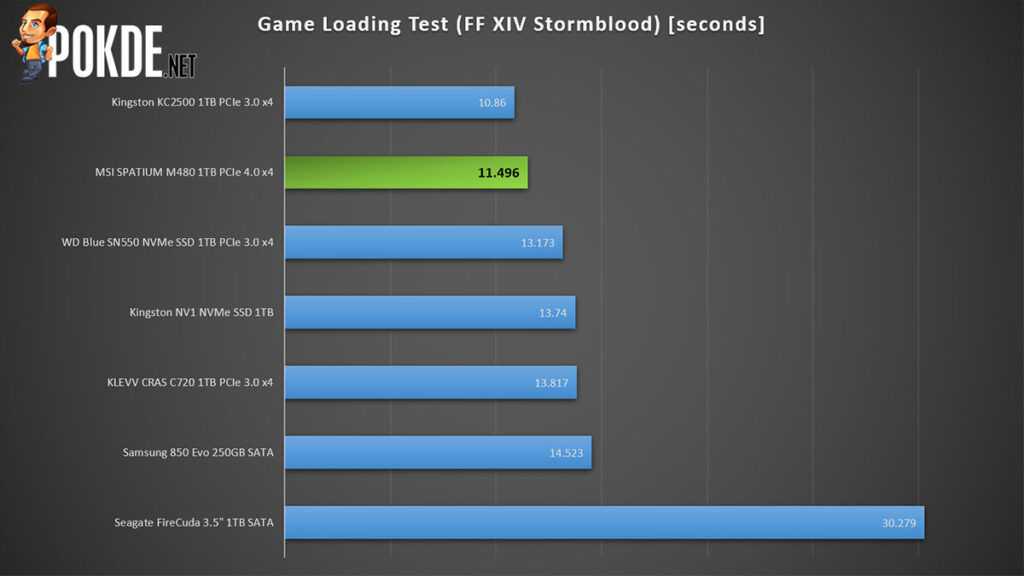 It seems that while the benchmark performance is excellent, our game-loading test shows that it isn’t the fastest SSD when it comes to game loading times, at least in Final Fantasy XIV: Stormblood. With that said, only the Kingston KC2500 is just a smidge faster, with the MSI SPATIUM M480 outperform the rest of the stack quite easily.