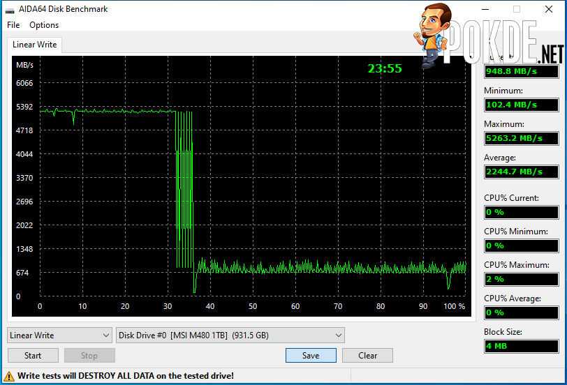 This linear write test in AIDA64 puts the drive through continuous writes, and we can see that the MSI SPATIUM M480 maintains speeds of around 5.2GB/s until about the 33% mark, which should be its SLC cache capacity. After some massive fluctuations, we see that it manages speeds of around 1GB/s, averaging 2.2GB/s at the end of the test.