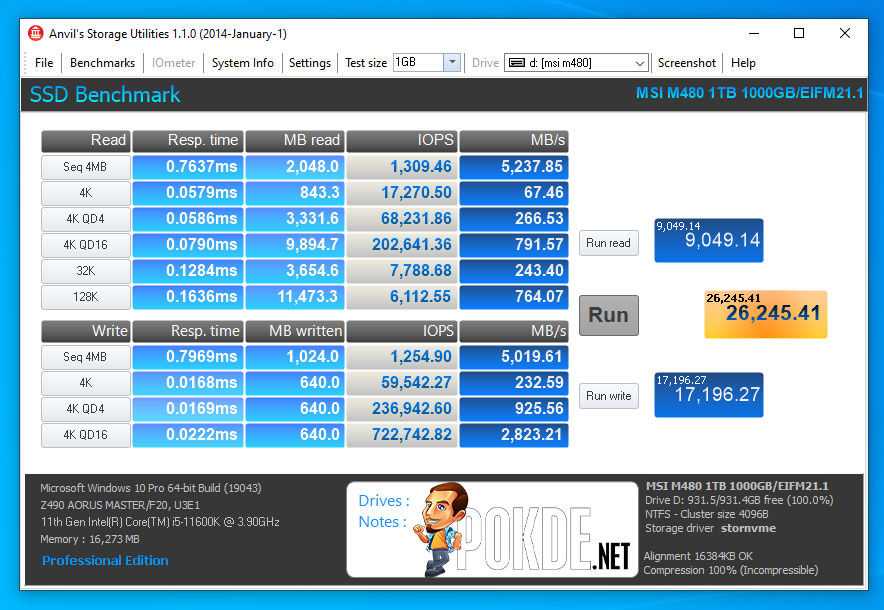 Anvil’s Storage Utilities sees it slightly slower, but it still maintains speeds well above the 5000MB/s mark.