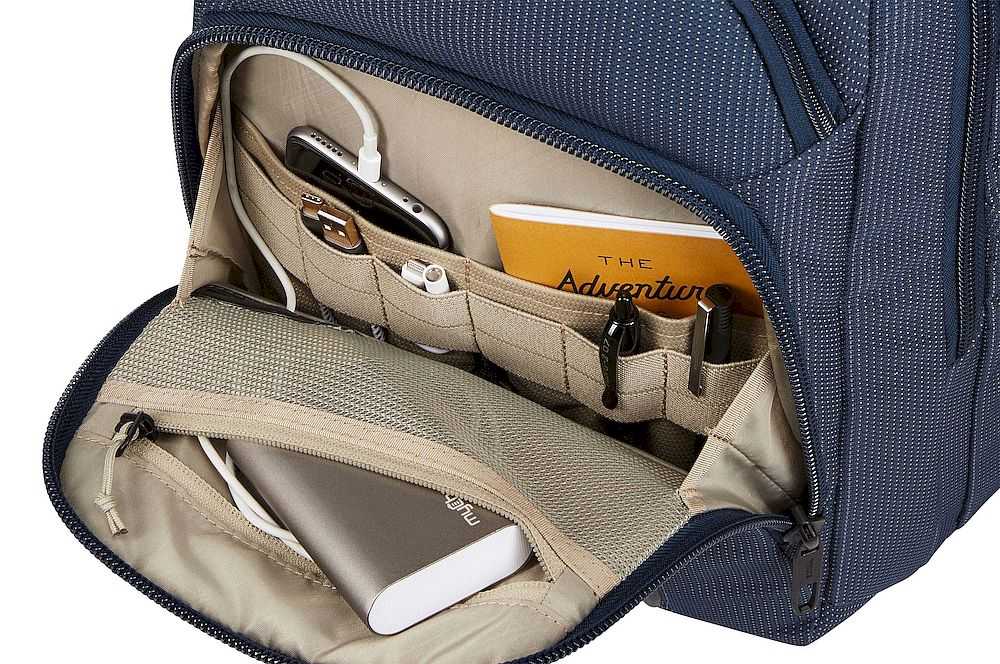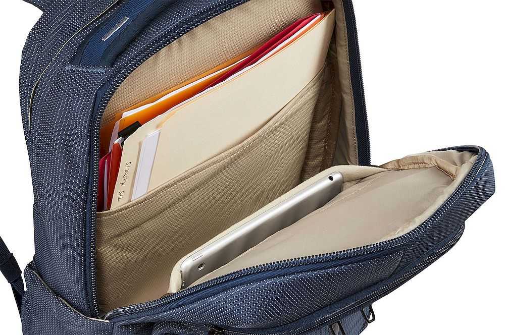 В модели на 32 л предусмотрено два глубоких отделения: одно основное с небольшим сетчатым карманом в верхней части для мелких предметов и второе, предназначенное для размещения ноутбука с диагональю до 15,6 дюймов, планшета, бумаг. В модели на 25 л основной отдел объединен с отделением для ноутбука, следовательно, перегородка с сетчатым карманом отсутствует. Кроме того, в рюкзаке Thule Crossover Backpack 32L на фронтальной поверхности внешнего кармана есть еще одно отделение с карабином для регулировки объема. В модели на 25 л оно заменено на карман, закрывающийся на молнию.