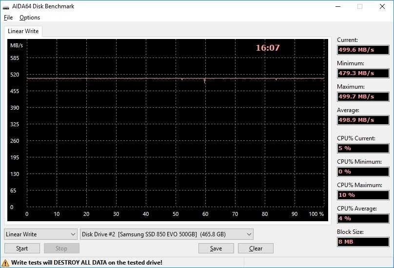 Чтобы увеличить скорость записи для Samsung 850 EVO используется механизм TurboWrite. Фактически речь идет о классическом SLC-буфере для которого выделяется часть объема накопителя – 6 ГБ в случае с накопителем на 500 ГБ. Для SSD на базе флеш-памяти c TLC такой массив зачастую оказывается очень полезен. Но, здесь случай особый. Несмотря на то, что Samsung 850 EVO также использует память с трехбитными ячейками, изначально повышенную скорость записи позволяет поддерживать трехмерная компоновка 3D V-NAND и производительный двухъядерный процессор Samsung MGX с восьмиканальным доступом к массиву флеш-памяти. В совокупности, на графике последовательной записи в AIDA64 мы видим прямую линию на уровне 500 МБ/c. Характерного для накопителей на базе TLC падения производительности после исчерпания SLC-буфера не происходит.