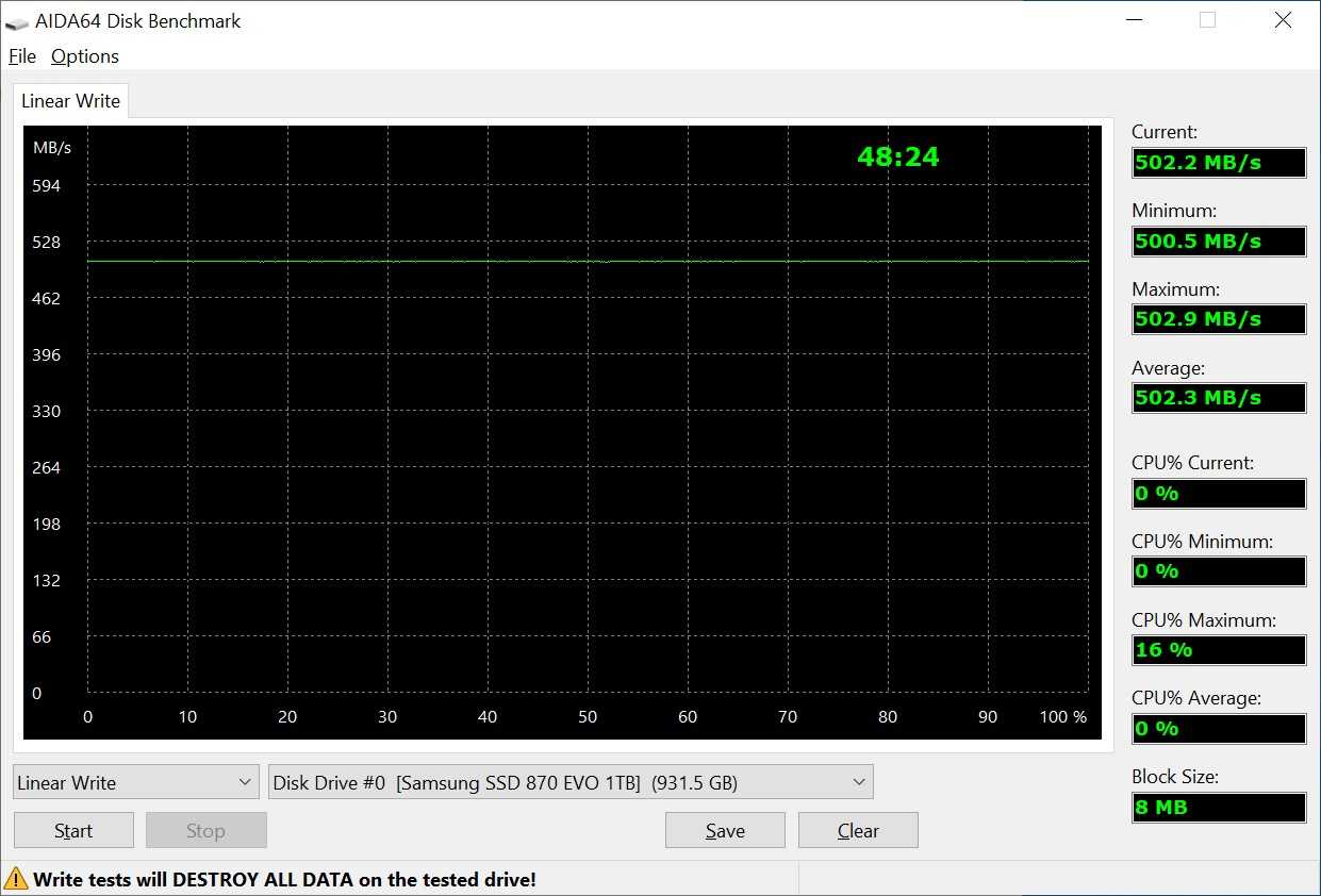 Здесь можно было бы удивляться, если бы подобную картину мы не наблюдали еще во время тестирования предшественника – Samsung 860 EVO 1 ТБ. Впрочем, у модели предыдущего поколения средний темп записи был несколько ниже – 485 МБ/c.