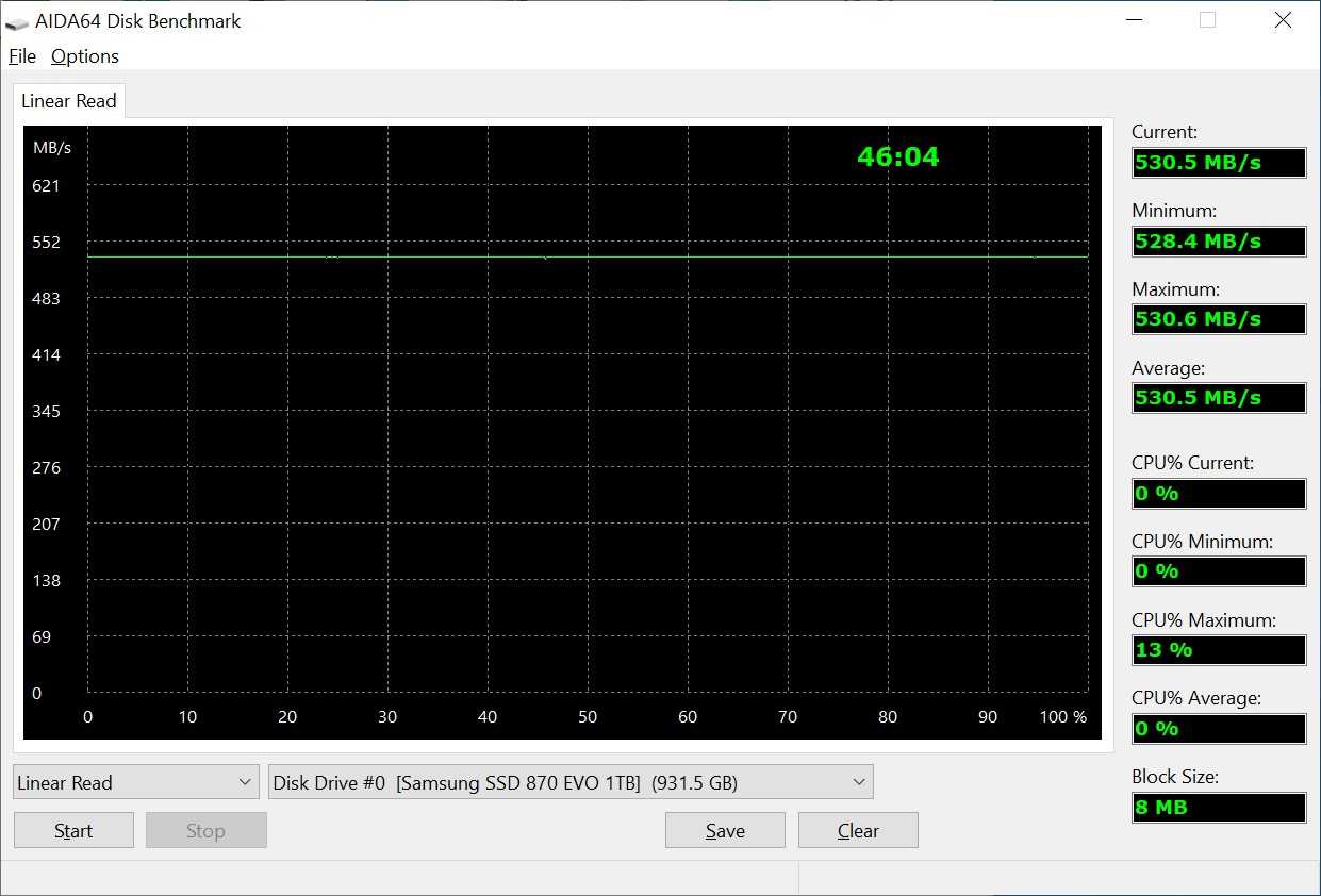 Утилита AIDA64 регистрирует стабильные 530 МБ/c при чтении данных. Однако на этом этапе нас, пожалуй, больше интересует скорость записи и работу фирменного механизма кеширования Intelligent TurboWrite.